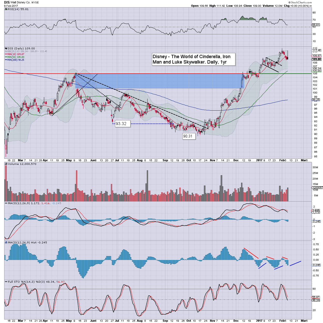There was rather dynamic action in Disney (DIS), after Q4 earnings were rather mixed. From a Tue' AH flash-print low of $105.50, DIS gained in early morning to a high of $111.42, and settling u/c @ $109.00. Near term outlook offers cyclical upside to around $115.